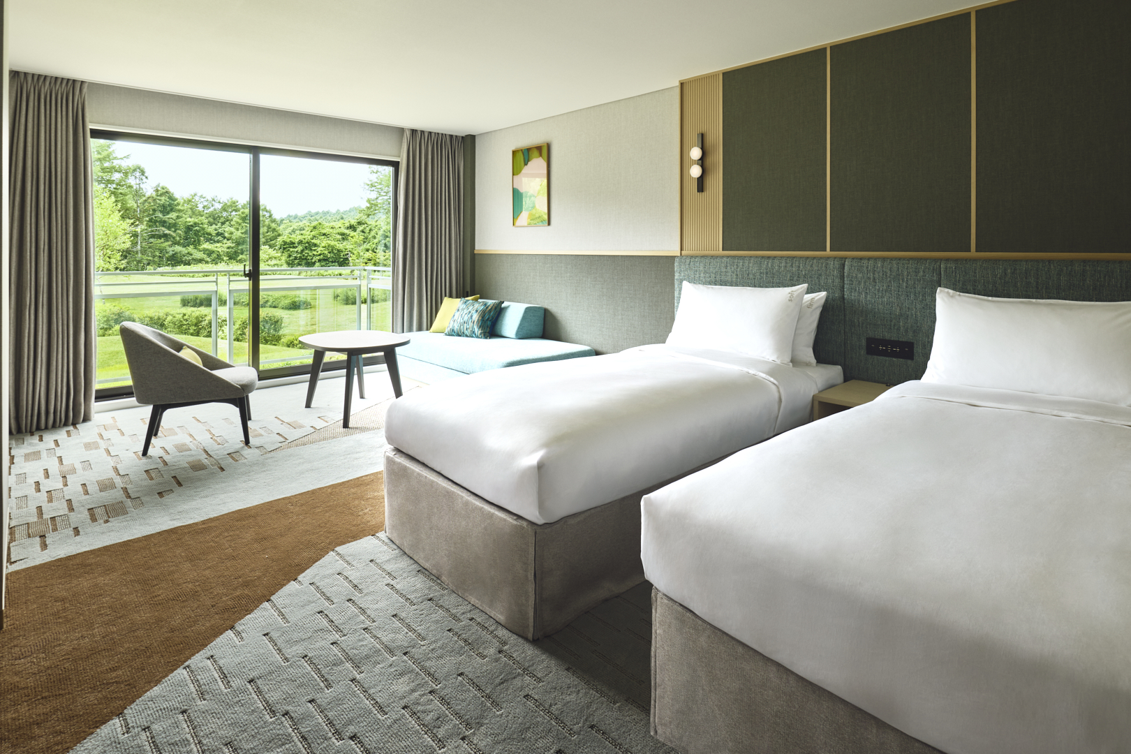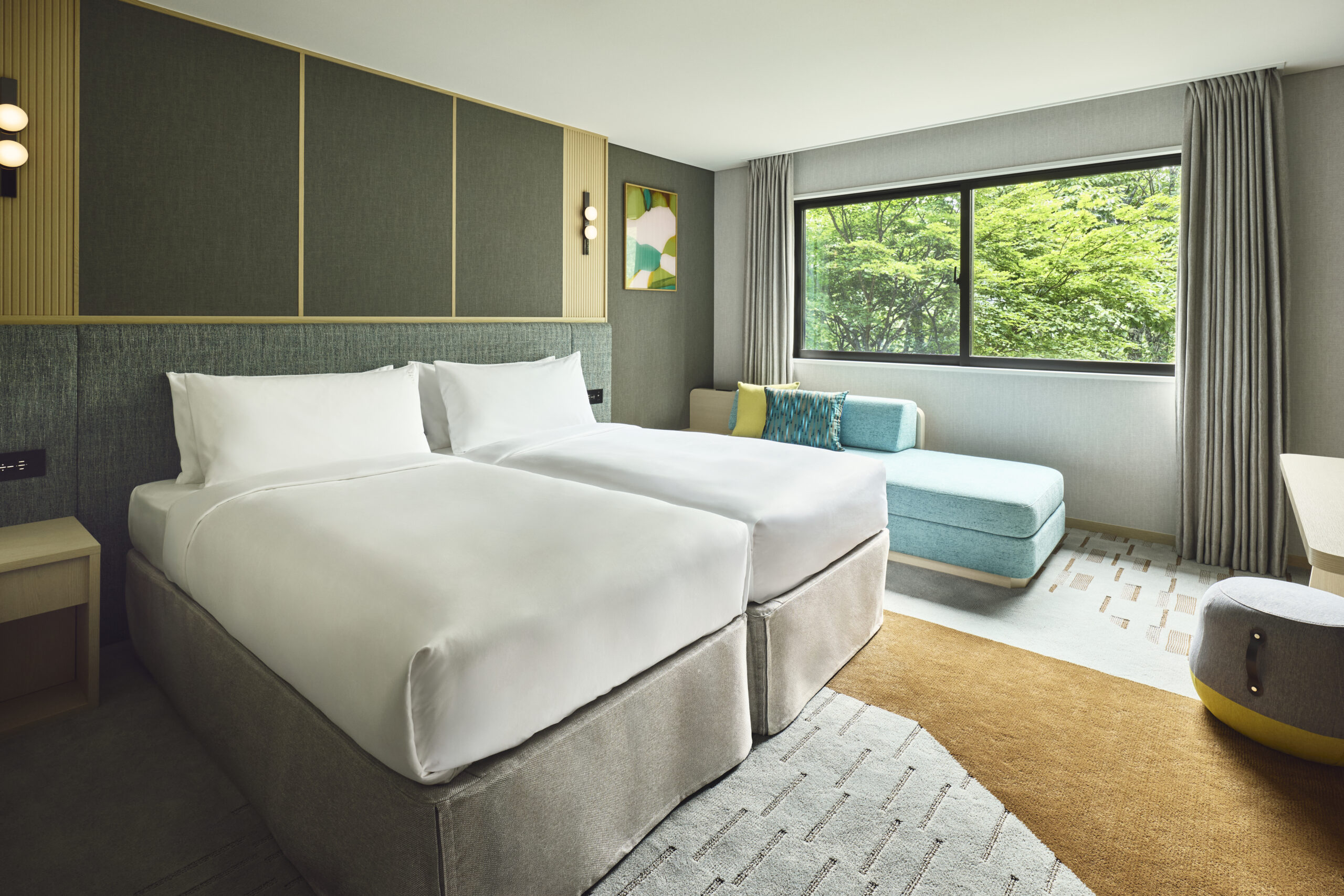 窓から差し込むやわらかな自然光が、ツインベッドが並ぶお部屋を優しく包み込みます。自然と調和した落ち着きのあるデザインが、訪れるすべての方に穏やかな安らぎをもたらします。