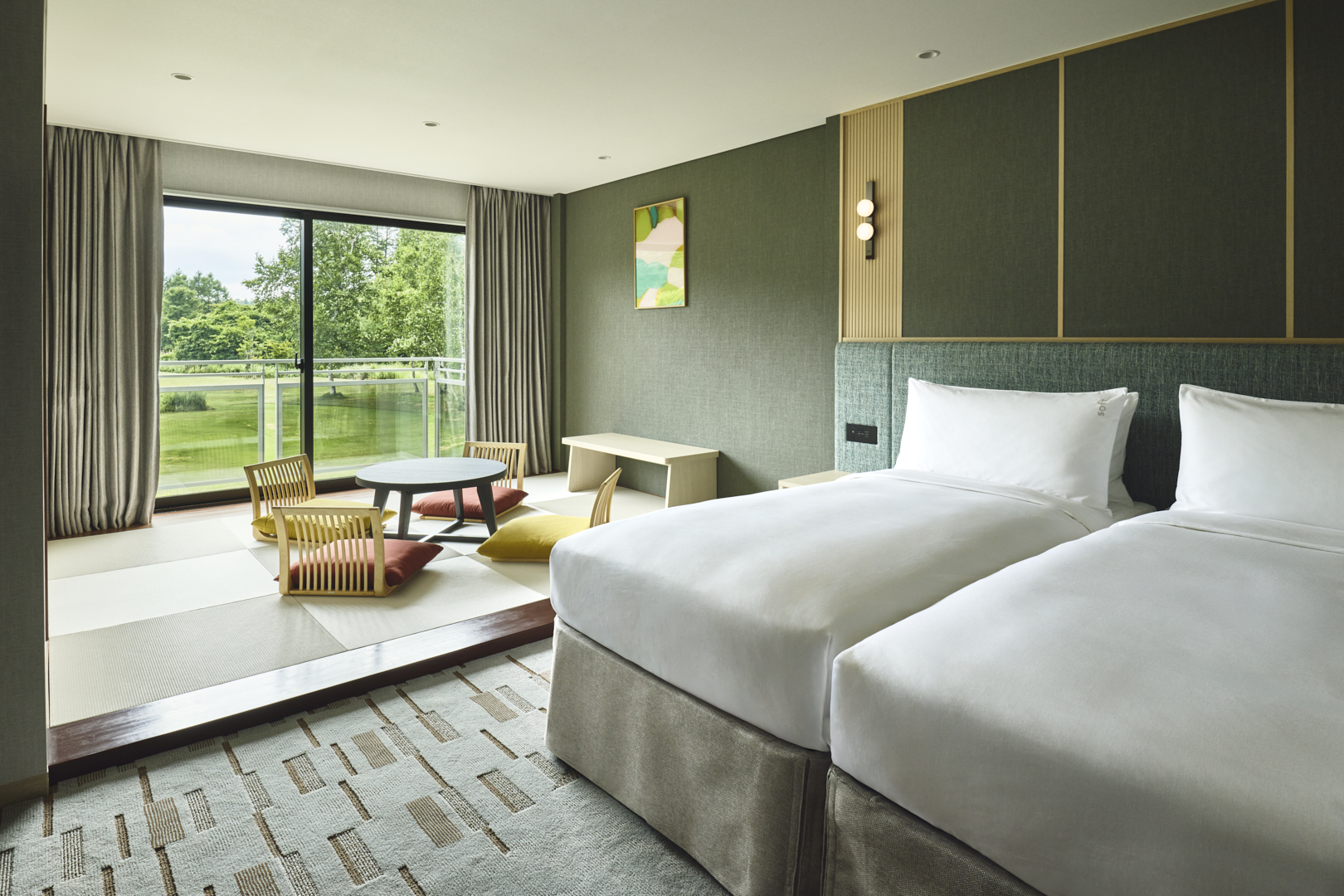 52㎡ / 定員4名様ツインベッドの快適さと、畳の温もりに包まれた和室のリビングが融合したプレミアムルーム。テラスからは浅間山の雄大な景色と、季節ごとに表情を変える自然が広がり、静けさと癒しに満ちた贅沢な時間をお届けします。