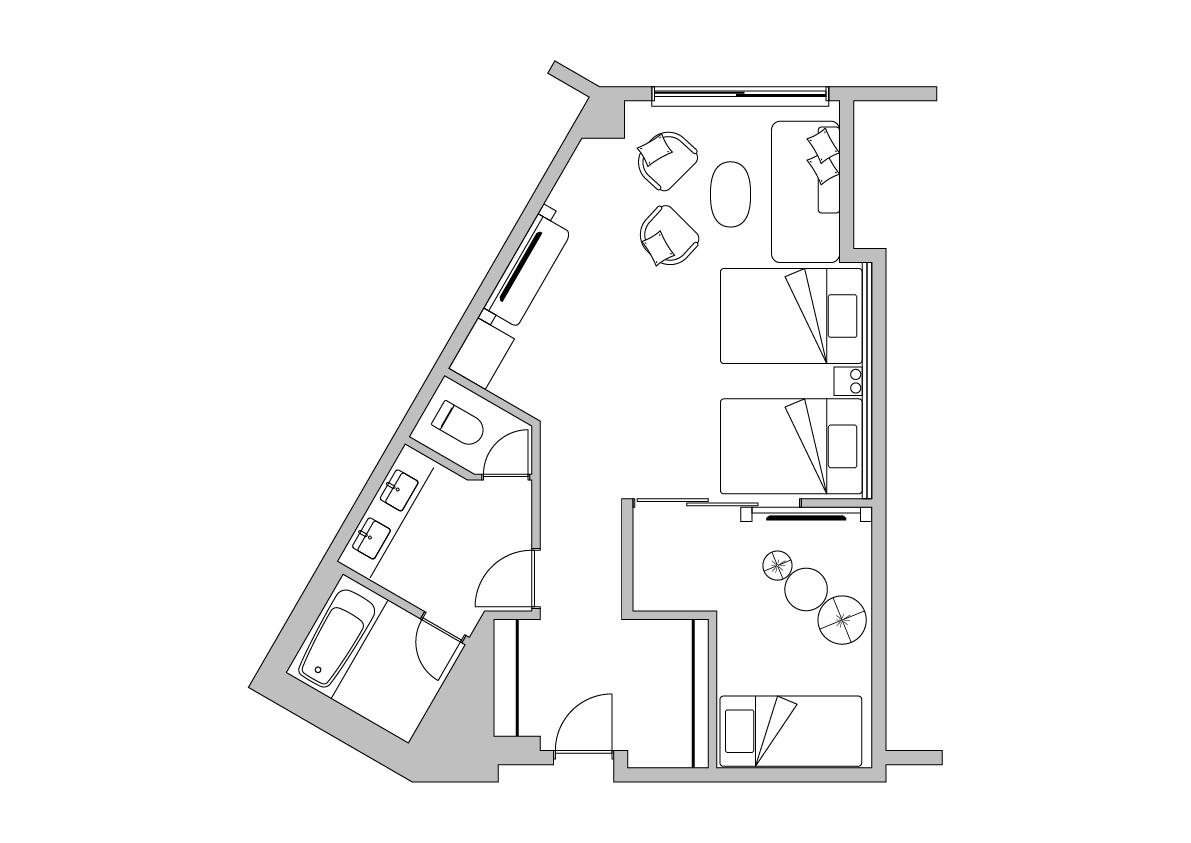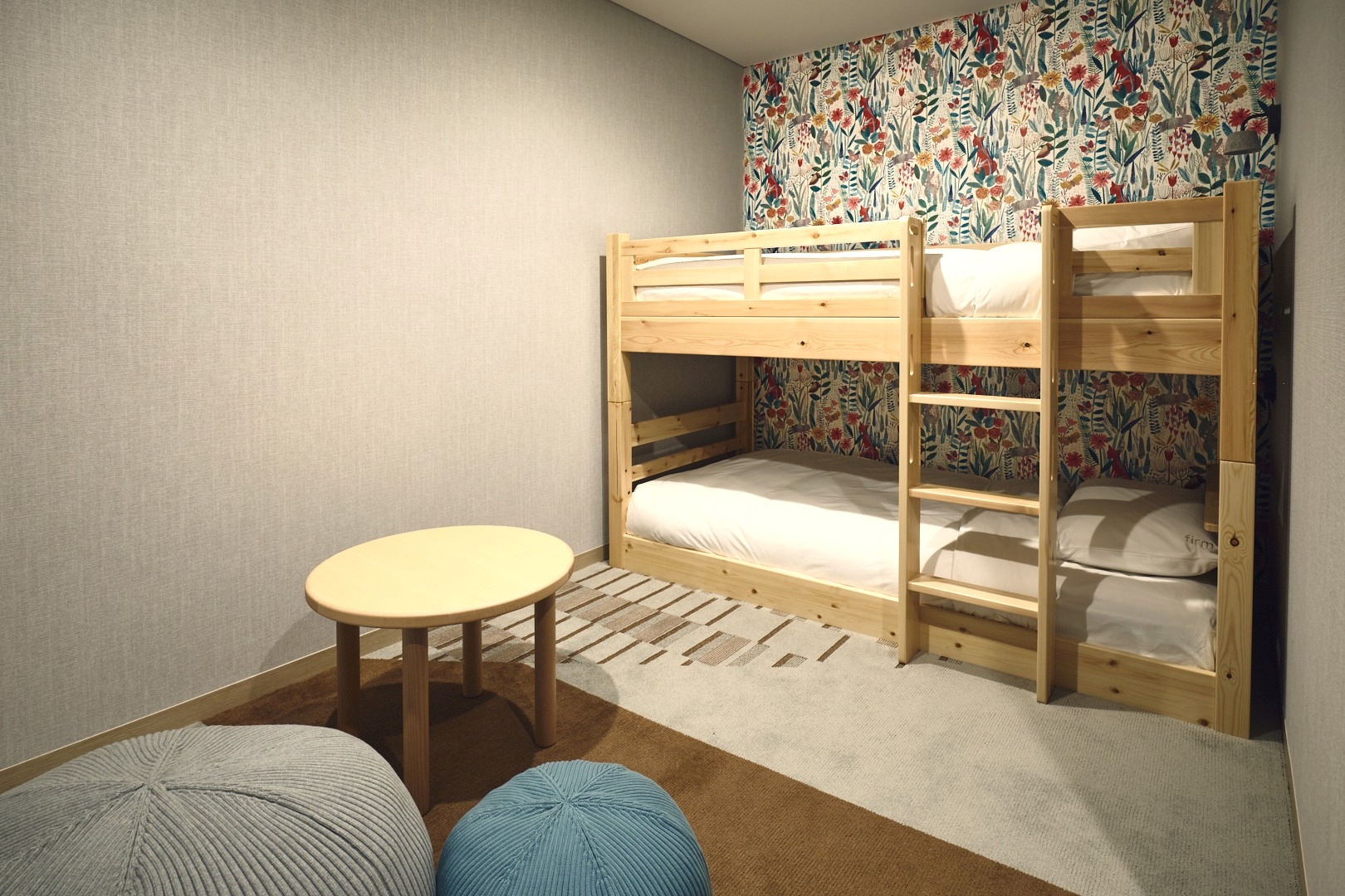 ツインベッドと2段ベッドを備えたスイートルームは、小さなお子様連れのご家族に最適な設計です。広々とした室内には、温もりを感じるインテリアが調和し、安心してお過ごしいただける快適な空間をご提供します。ご家族の特別な滞在に、快適で楽しい時間をお過ごしいただけます。
