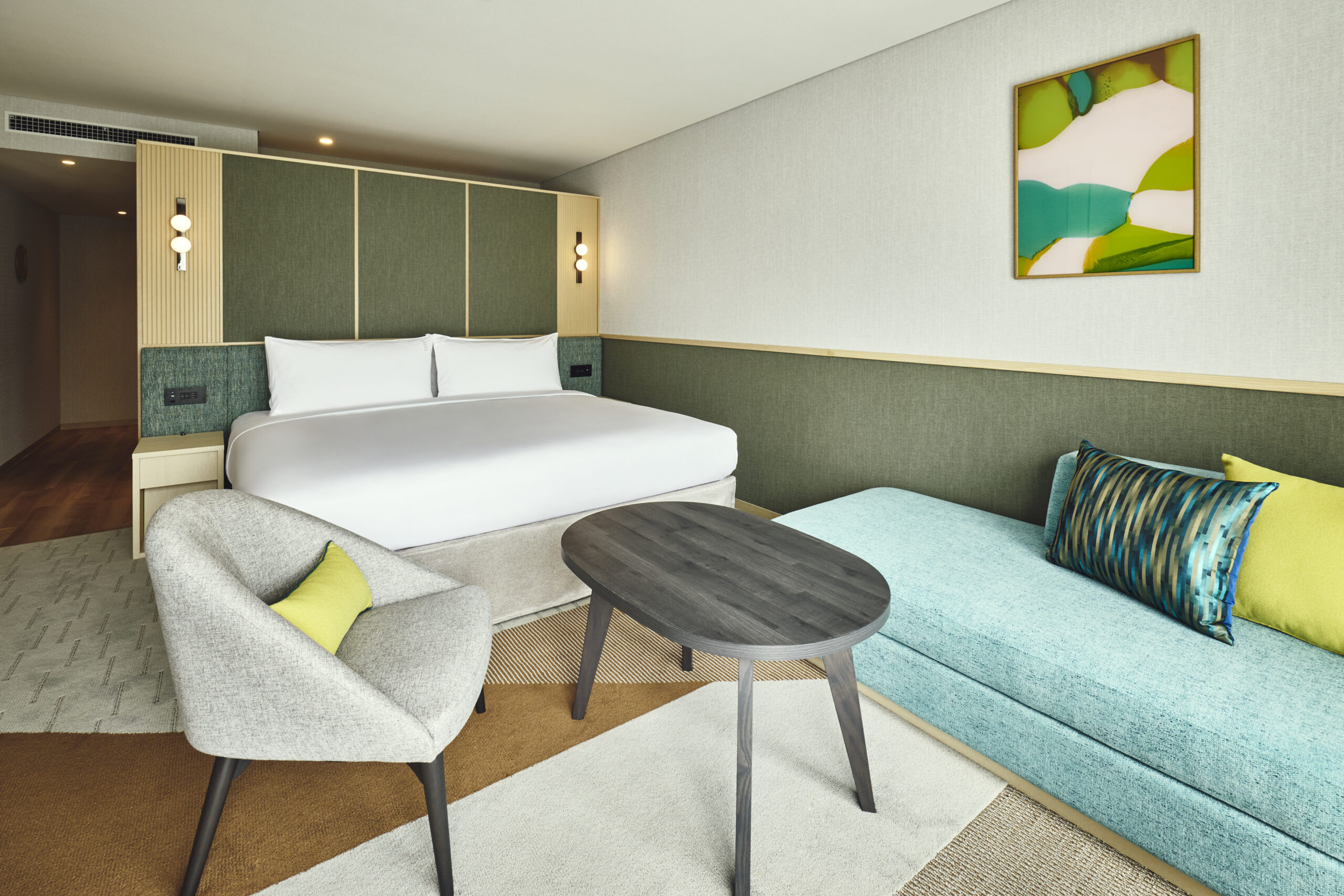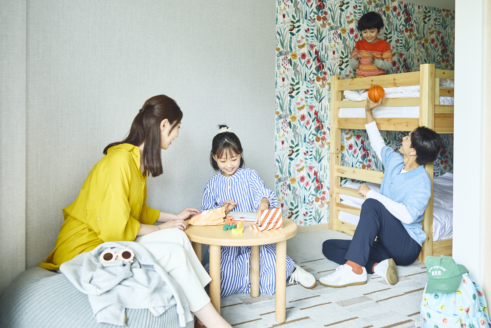 お子様がワクワクがする、カラフルで楽しいインテリアと2段ベッドを備えたキッズスペースがあるスイートルーム。小さなお子様連れのご家族に最適な空間です。