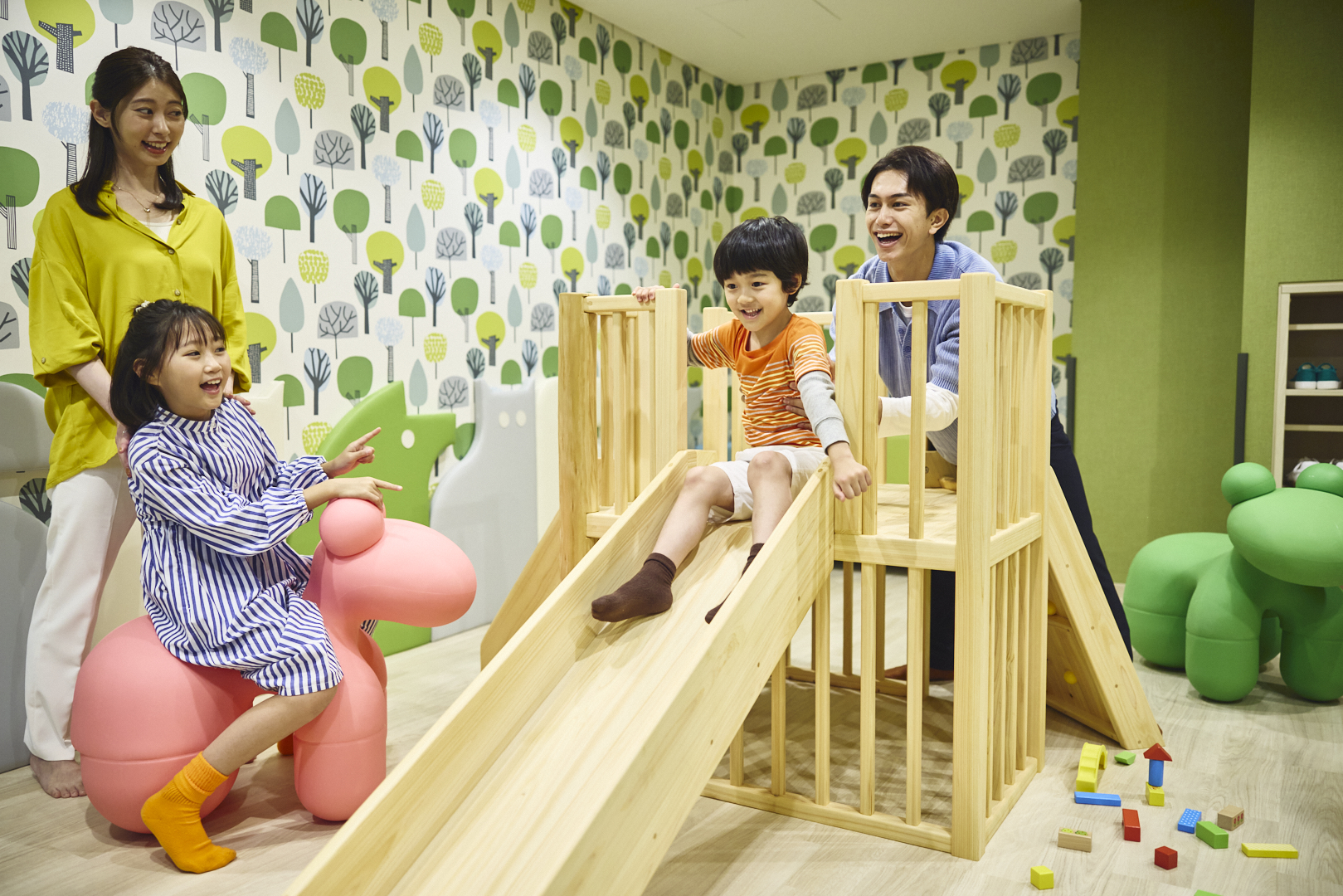 周囲の森に溶け込むような木の風合いを活かした内装に、豊かな四季の移ろいを反映したインテリアを施しました。スペースの中心には大きな木製遊具を備え、あらゆる年齢のお子様が楽しく遊べる自然の素材を生かしたおもちゃもご用意しています。